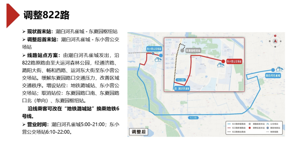 拟调整822路,调整后,线路由潮白河孔雀城发出,沿822路原路线至大运河森林公园,经通济路、潞阳大街、畅和西路、运河东大街至东小营公交场站。增设站位:地铁潞城站、东小营公交场站;取消站位:东夏园路口南、东夏园路口北(单向)、东夏园枢纽站。沿线乘客可改在“地铁潞城站”换乘地铁6号线。