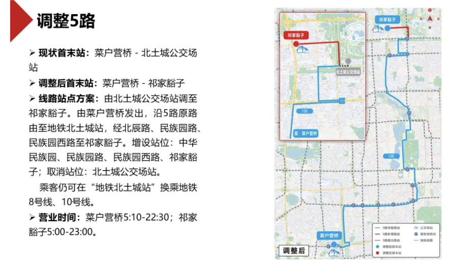 该批次调整方案中,还计划调整5路,线路由菜户营桥发出,沿5路原路线至地铁北土城站,经北辰路、民族园路、民族园西路至祁家豁子。增设站位:中华民族园、民族园路、民族园西路、祁家豁子;取消站位:北土城公交场站。