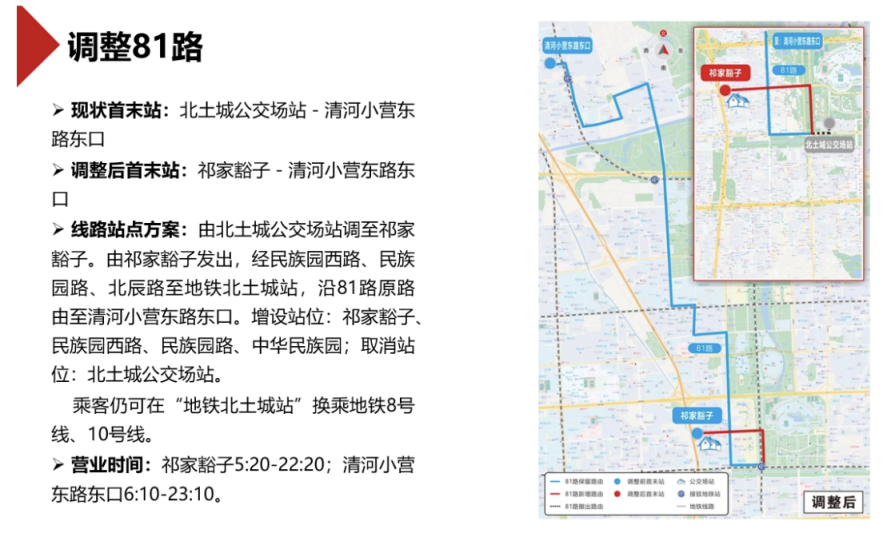 拟调整81路,线路由北土城公交场站调至祁家豁子。由祁家豁子发出,经民族园西路、民族园路、北辰路至地铁北土城站,沿81路原路线至清河小营东路东口。增设站位:祁家豁子、民族园西路、民族园路、中华民族园;取消站位:北土城公交场站。