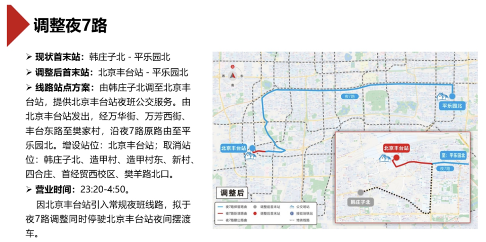 此外,为了更好地服务丰台站地区出行,拟调整夜7路,由韩庄子北调至北京丰台站,提供北京丰台站夜班公交服务。线路由北京丰台站发出,经万华街、万芳西街、丰台东路至樊家村,沿夜7路原路线至平乐园北。增设站位:北京丰台站;取消站位:韩庄子北、造甲村、造甲村东、新村、四合庄、首经贸西校区、樊羊路北口。营业时间为23时20分至4时50分。因北京丰台站引入常规夜班线路,拟于夜7路调整同时停驶北京丰台站夜间摆渡车。