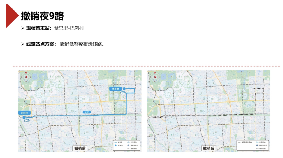 另有一条单车次不足3人次的低客流夜班线路——夜9路(首末站:慧忠里-巴沟村)拟予以撤销。